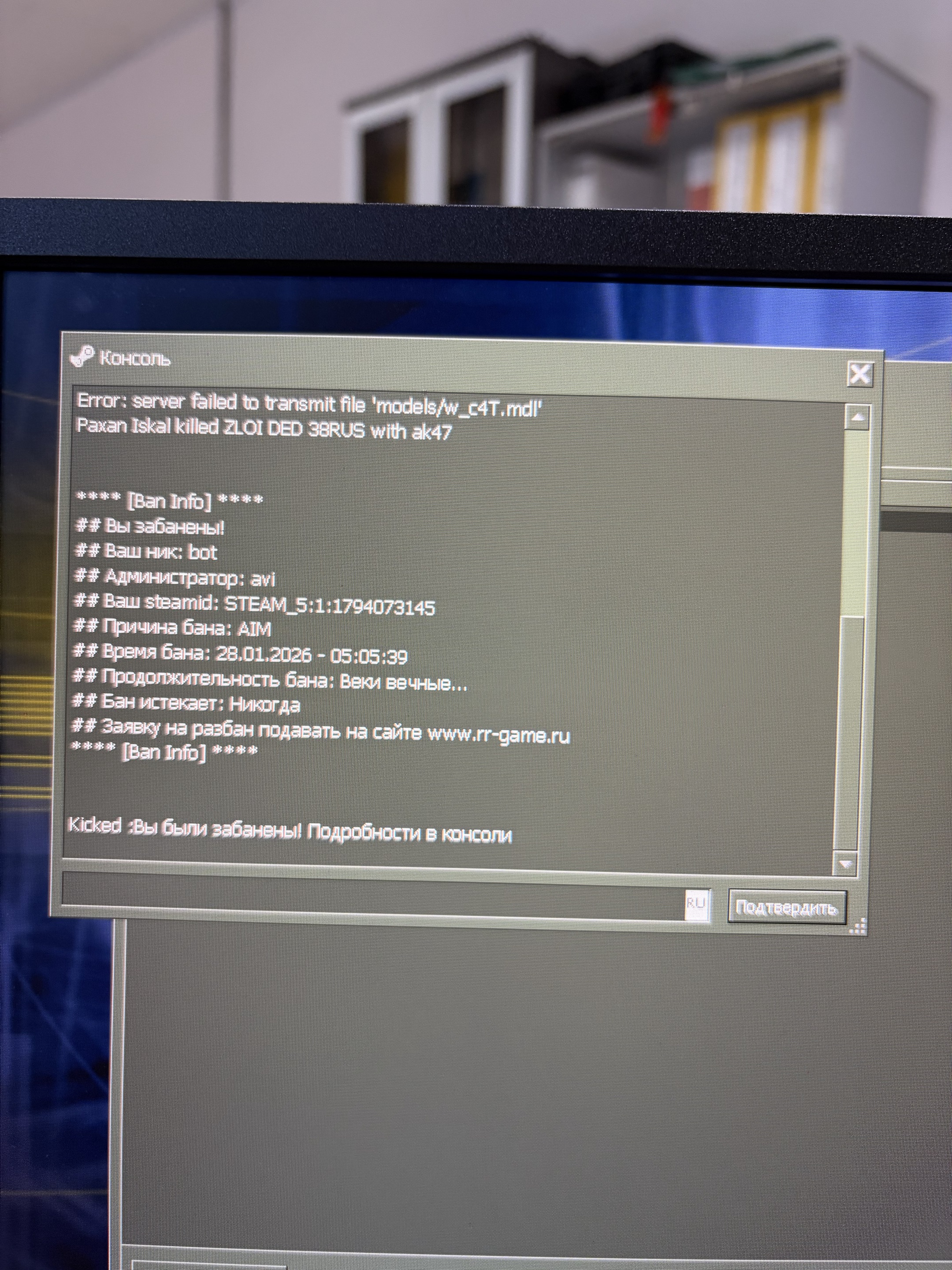 Здравствуйте! Меня почему-то забанили. Я почти месяц не играл, играю на работе. Читов не было да и не знаю как ставить и никаких оскорблений не писал не говорил. Мне душевно и очень нравится играть только в вашем сервере: РУССКИЙ РАЗМЕР & ТИПИЧНЫЙ DUST2. Мой ник вообще другой, по нику bot играл мой коллега, он вообще читами не пользуется (просто играет очень отлично)